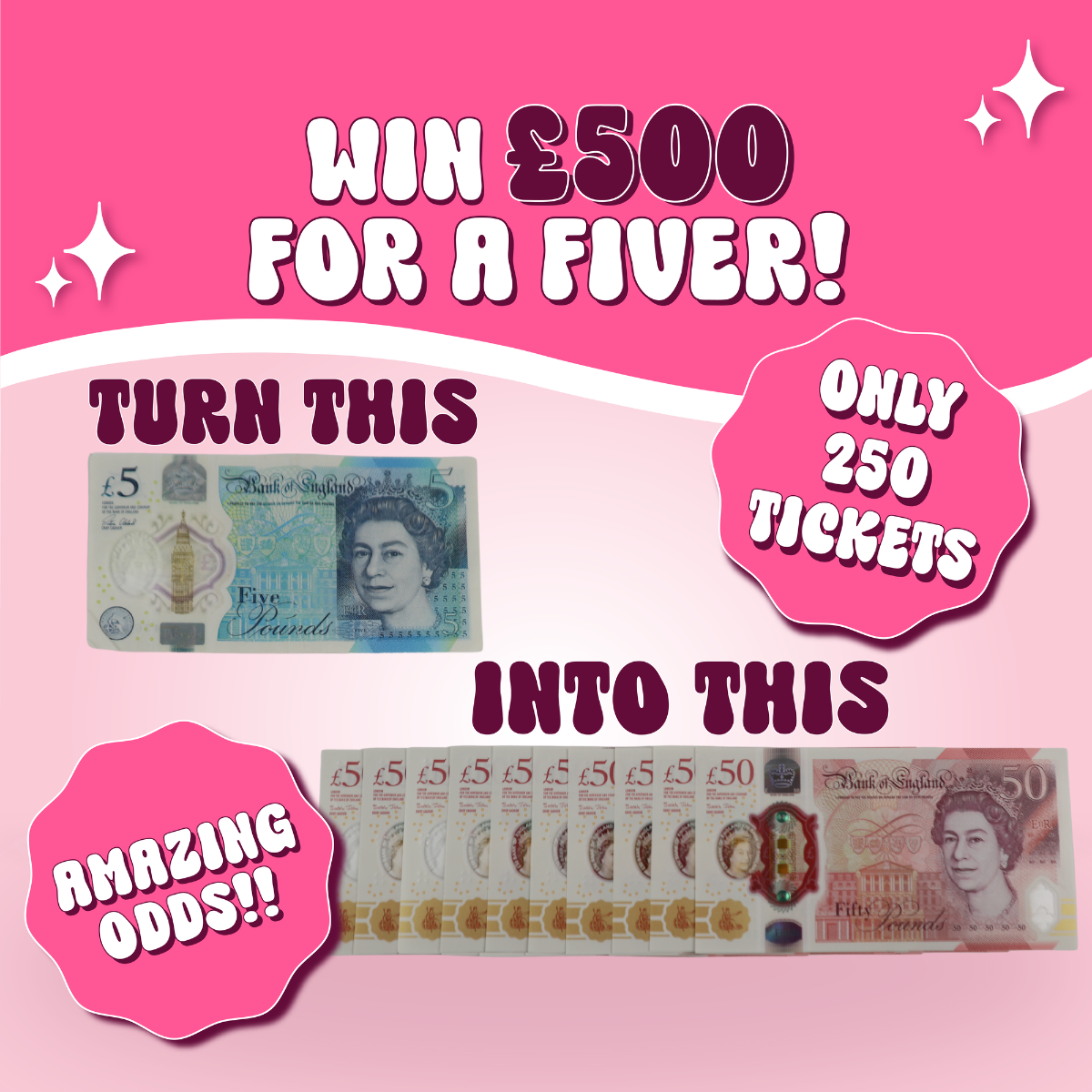 Here’s your chance to turn a fiver into £500! With only 250 tickets available, the odds are better than most — and there are plenty of chances to win along the way.
